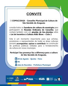 Na próxima quinta-feira, 28 de agosto, o Conselho Municipal de Cultura de São Geraldo do Araguaia (COMUC/SAGA) realizará uma Reunião Ordinária, a partir das 9h, na sala de reuniões da Prefeitura Municipal. O encontro é aberto a todos os fazedores de cultura, artistas, produtores e representantes das mais diversas áreas culturais do município.